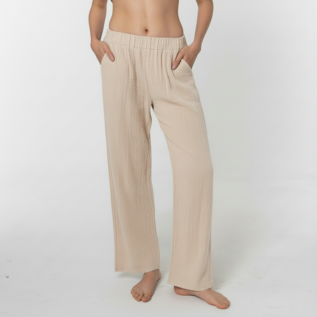 Crafted from Bambula 100% cotton, these pants are designed to offer both style and comfort. They feature two angled side pockets and a wide, supportive waistband, providing both convenience and a flattering fit.