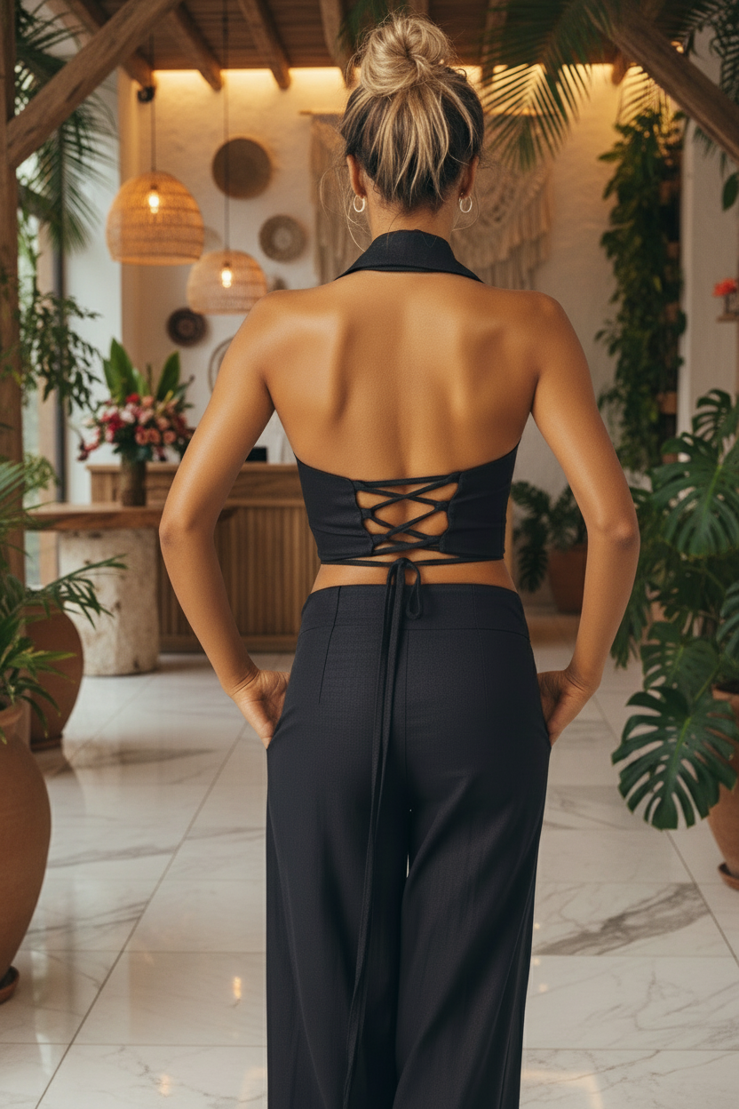 The Tuxedo halter top is meticulously crafted to marry style and comfort effortlessly, fashioned from airy linen fabric. Ideal for basking in sunny days or enjoying summer getaways, its design ensures you look chic while feeling at ease. The braiding detail at the back adds a hint of allure, elevating its charm and making it a versatile piece for any occasion.