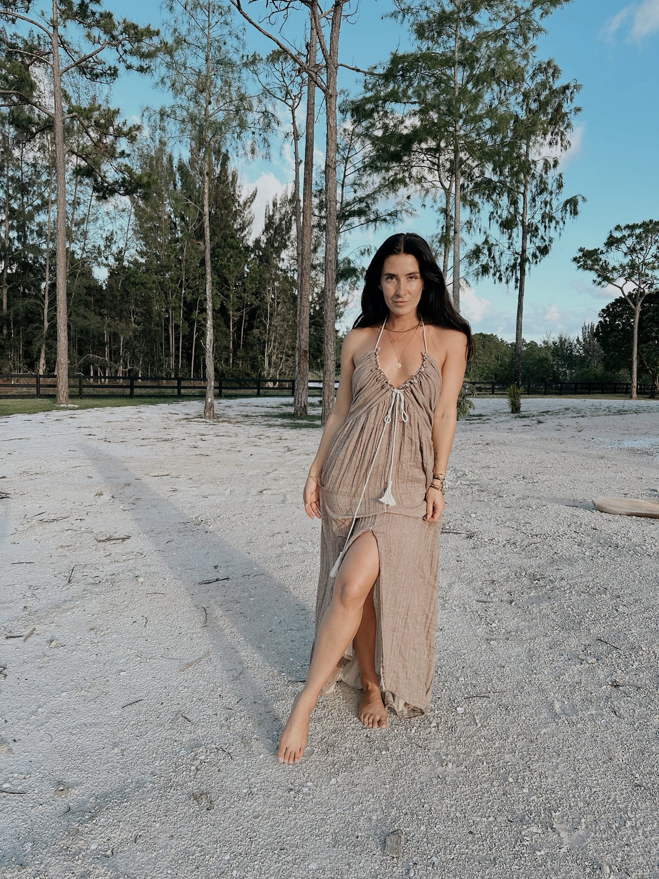 Introducing our Vintage Boho Long Dress. Embrace timeless elegance with a front opening in a stunning brown hue, perfect for your cocoa ceremonies. Effortlessly chic and deeply connected to nature.