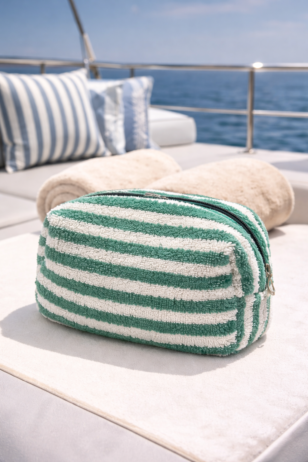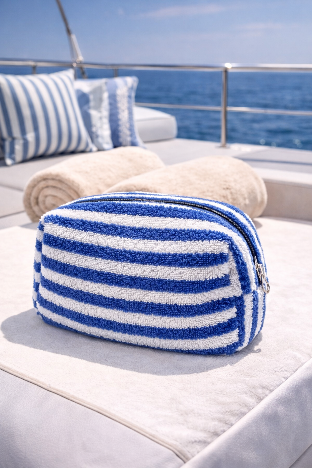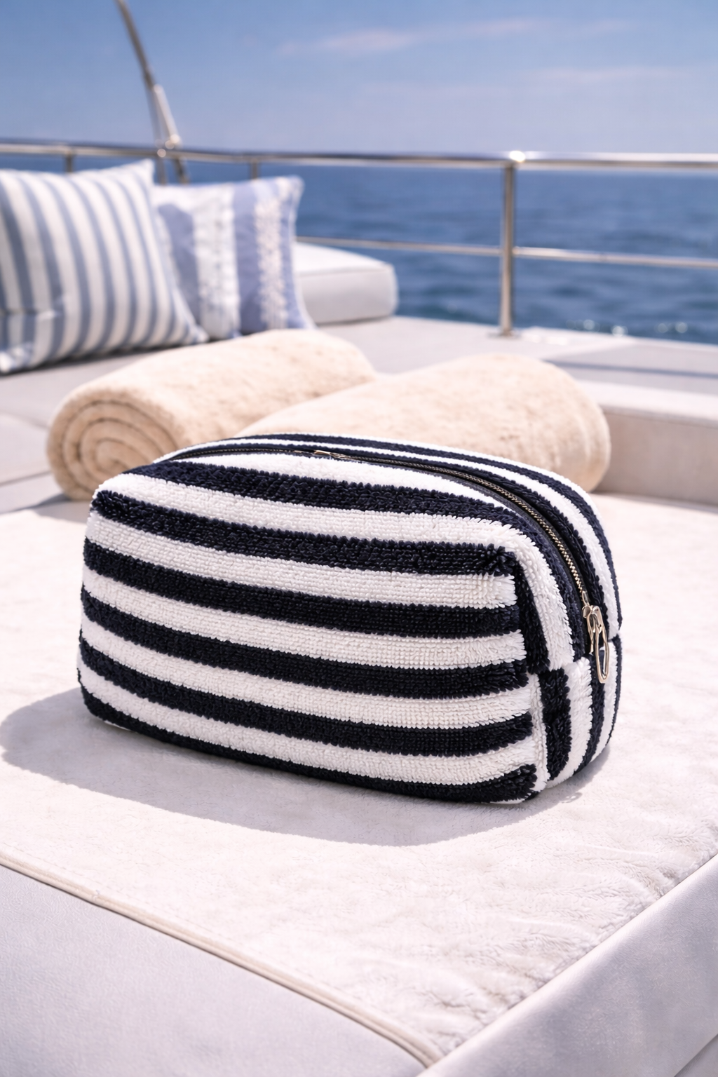 Designed to keep your beach essentials organized with effortless style, the Terry Zip Pouch is crafted from plush, absorbent terry cloth and finished with a clean, coastal aesthetic. Perfect for storing sunscreen, beauty essentials, or small travel items, it’s the ideal companion inside your beach tote or on its own.
