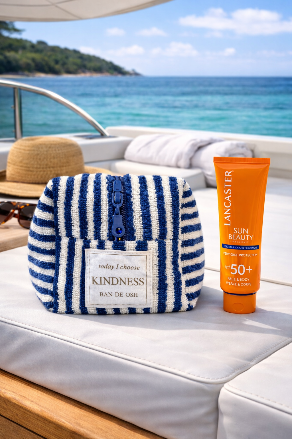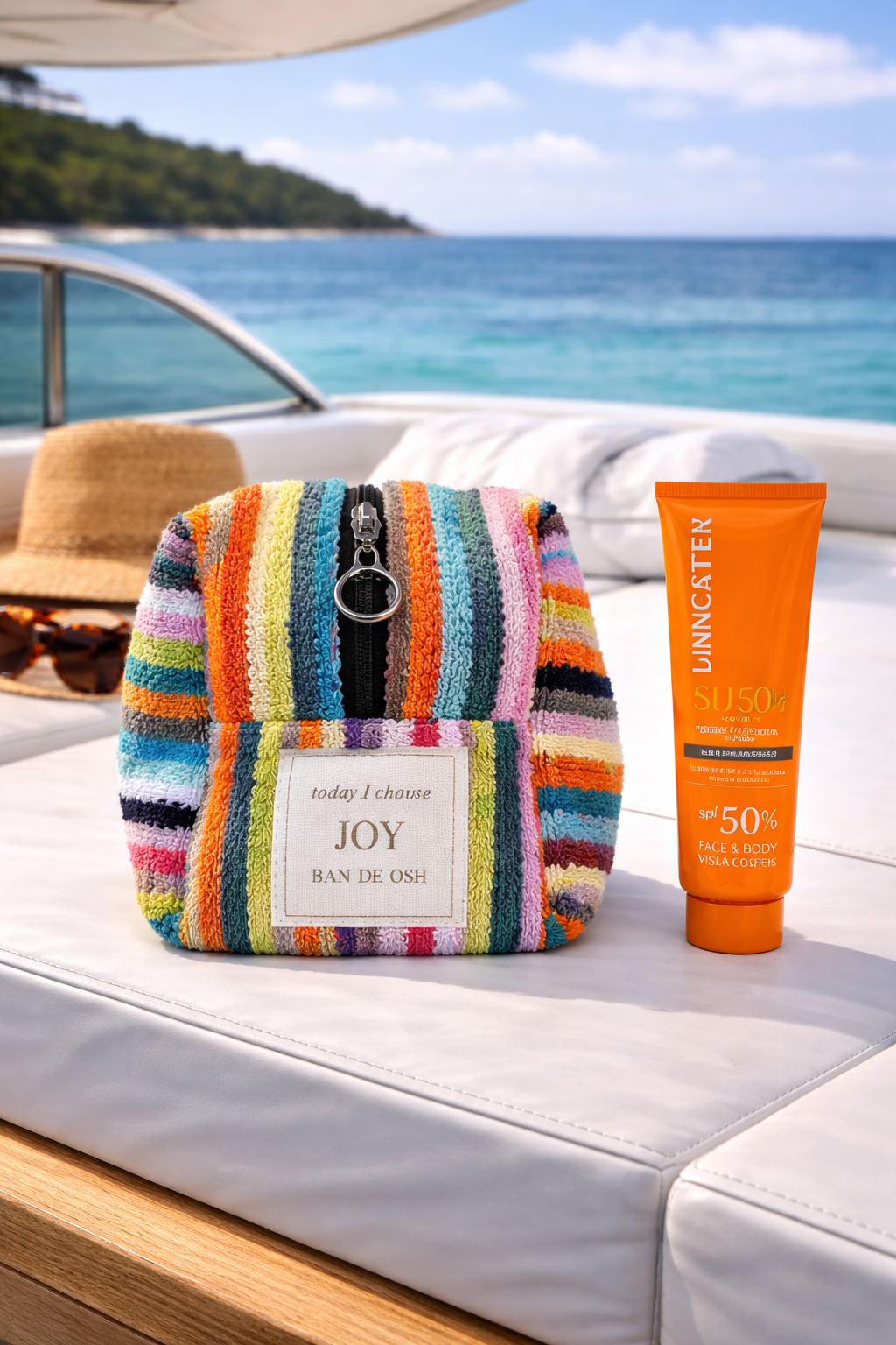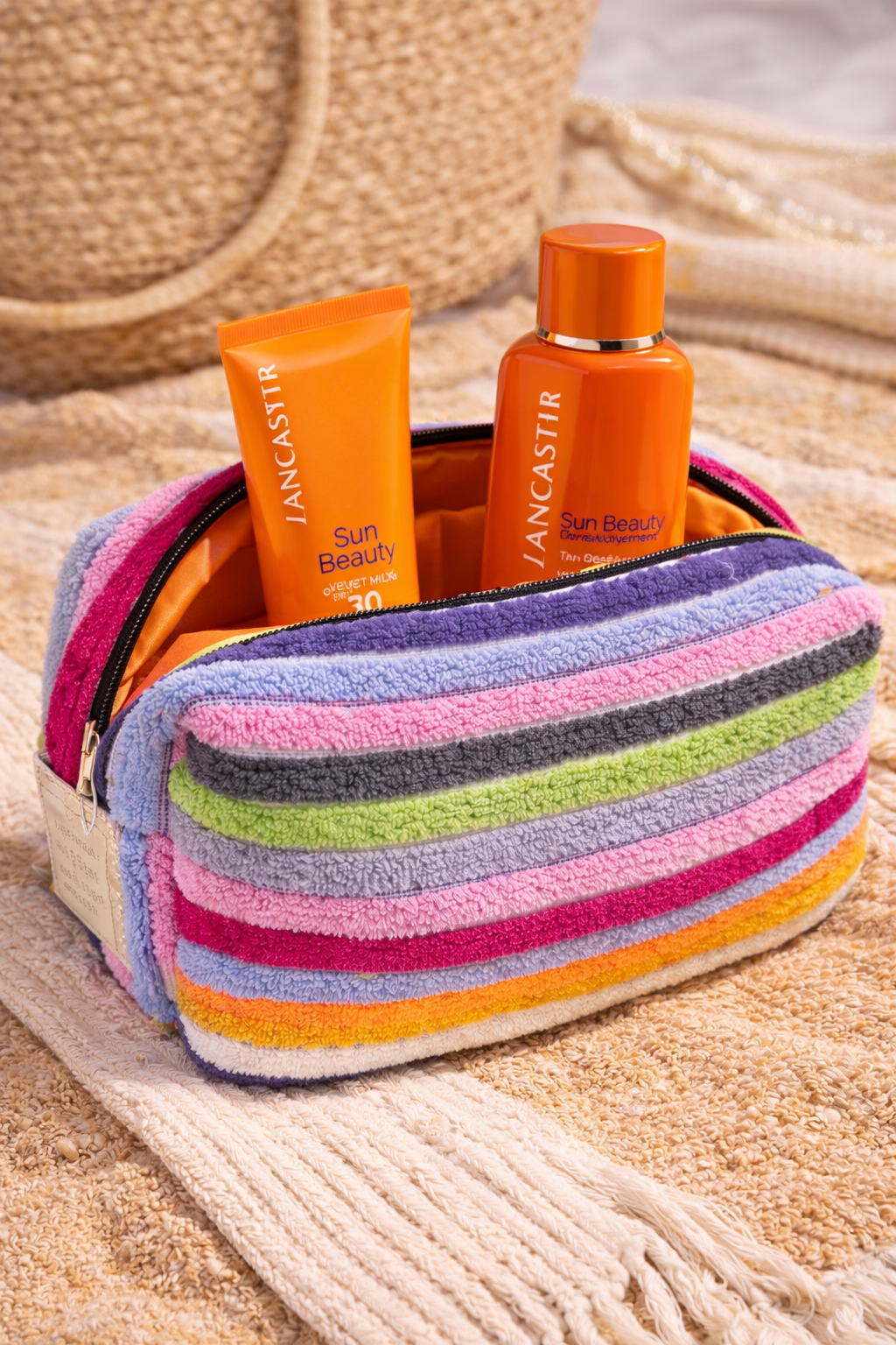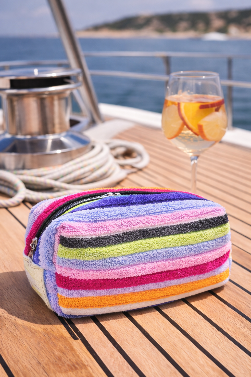 Designed to keep your beach essentials organized with effortless style, the Terry Zip Pouch is crafted from plush, absorbent terry cloth and finished with a clean, coastal aesthetic. Perfect for storing sunscreen, beauty essentials, or small travel items, it’s the ideal companion inside your beach tote or on its own.